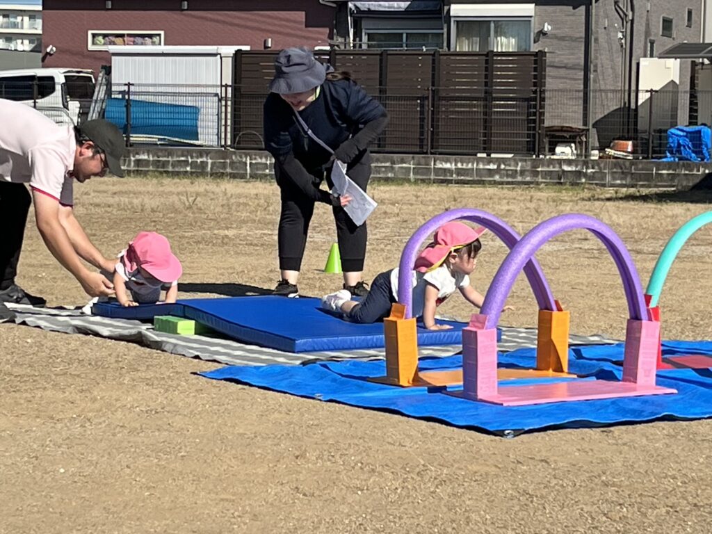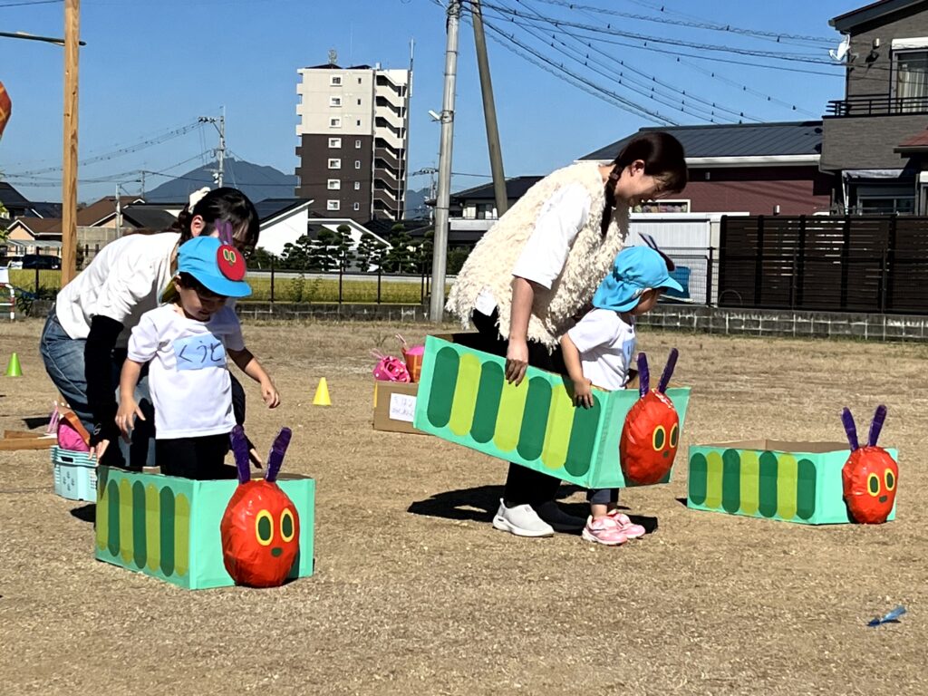 お歌を口ずさみながら、平均台やストーンブロックを渡り、最後には青虫になって親子でゴールしました!