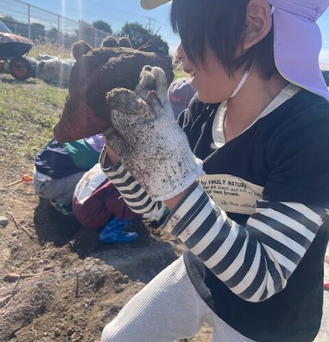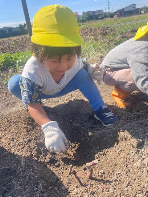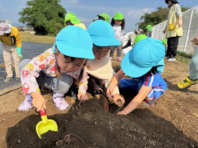 はな組のお友だちは小さな手で「よいしょ よいしょ」と土を掘り、大きなお芋を掘っていました🎵