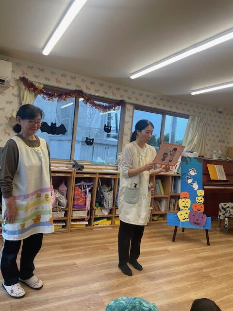 ハロウィンの由来や「トリックオアトリート」はどんな意味?などの話もありましたよ📚子ども達は興味津々に聞いていました✨