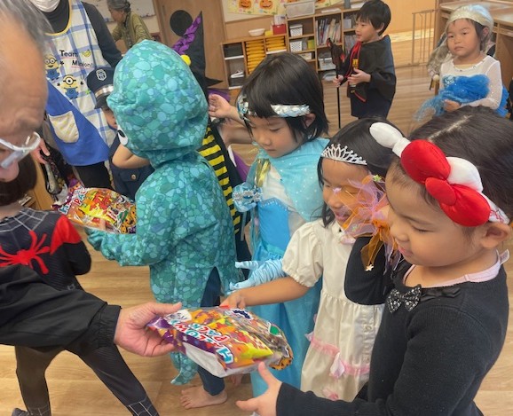 見せ合いっこが終わると、順番に「トリックオアトリートお菓子をくれなきゃいたずらするぞ」を合言葉にお菓子をもらって大喜びの子ども達🎃